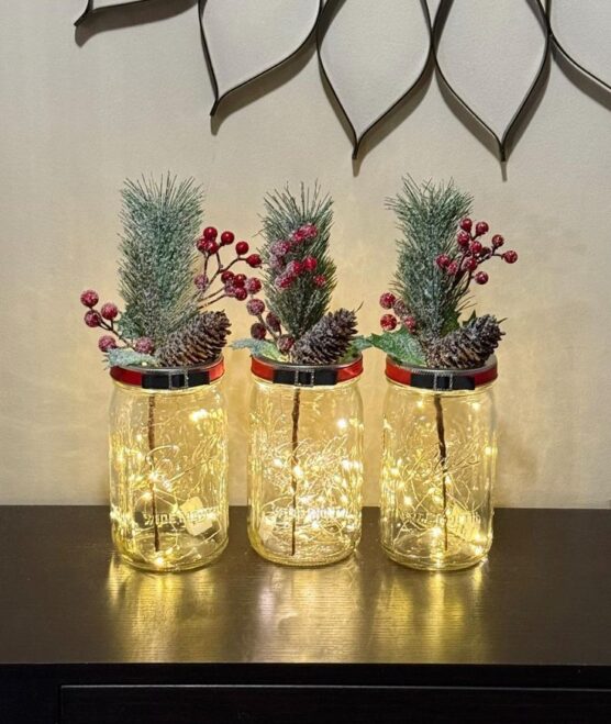 Mason jars are perfect for adding some festive magic, just grab a few in different sizes and stuff them with battery-powered fairy lights-the warm glow they give off is so cozy, especially on a chilly evening. Wrap thin red ribbons around the jar rims, then tuck in a couple sprigs of evergreen for an easy holiday touch.