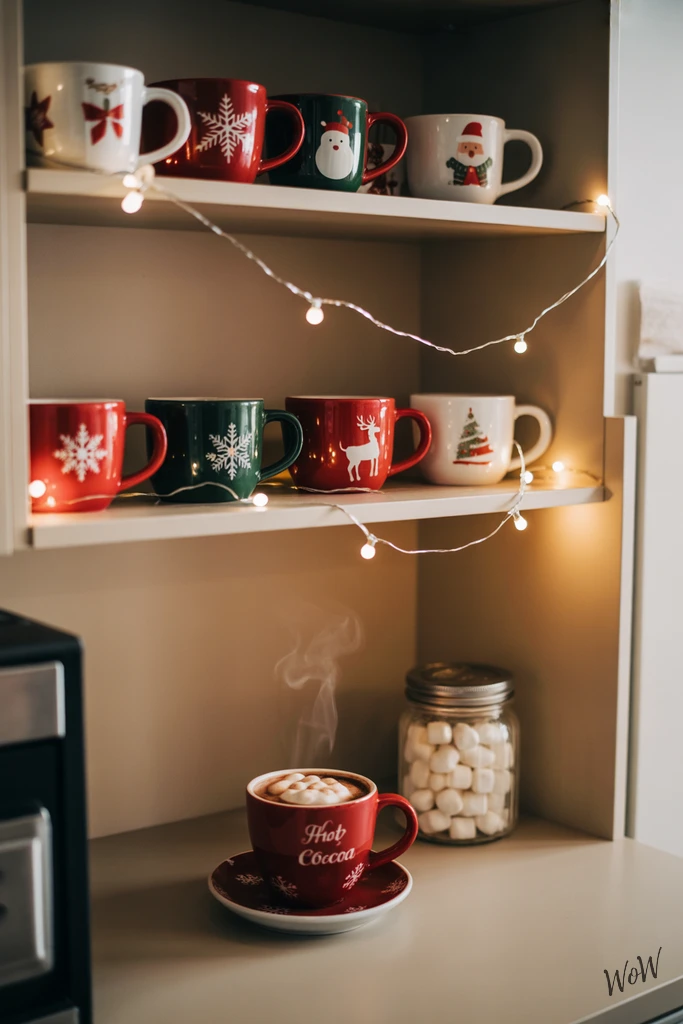 Open shelving turns your festive mug collection into holiday decor-line up your Christmas mugs with snowflakes, reindeer, or Santa faces for a cheery, collected look. To amp up the cozy factor, weave some fairy lights between the mugs, letting them softly glow around your mini coffee station.
