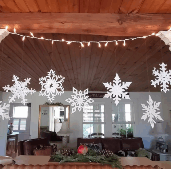 Use a push pin or removable hook to anchor fishing line to the ceiling, then tie or tape each snowflake at different heights above your dining table, cluster them tightly or let them float apart for a whimsical, cloud-like effect. The snowflakes catch daylight and glow in the evening, their shadows creating beautiful patterns on your walls.