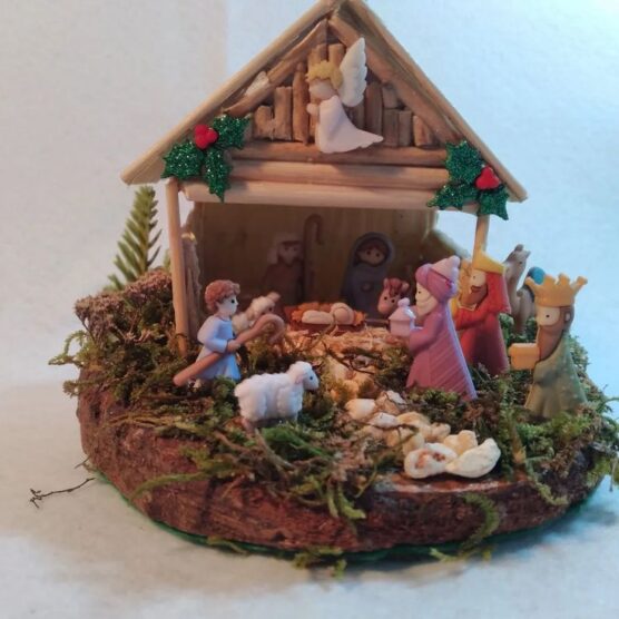 A wooden tabletop nativity scene adds cozy charm to any apartment, especially when nestled into a coffee table’s corner. Choose a handcrafted, compact set-delicately painted figurines look especially inviting against a soft moss bed.