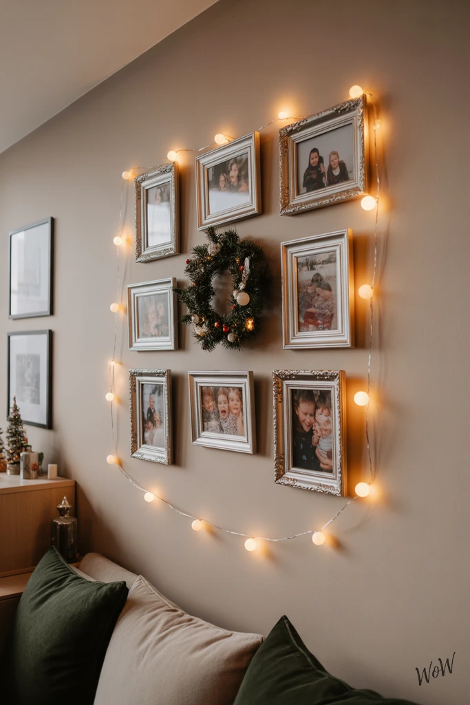 Soft, warm string lights draped around the frames add a gentle glow, making your family photos shine even more. If you’ve got a cozy reading nook beneath this setup, toss in a chunky knit blanket and a couple of plush pillows, you’ll have an irresistibly inviting corner.