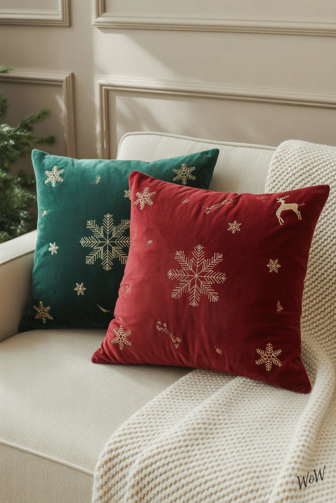 Plush velvet throw pillows in emerald green and cranberry red are pure holiday magic-especially when you pick ones with metallic snowflakes and reindeer embroidered on them. These rich colors pop against a small sofa and make everything feel cozier, even if your living room’s only got space for two.