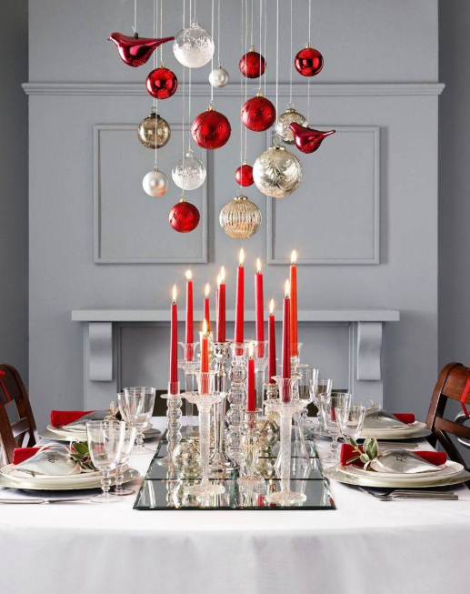 Suspend glass ornaments from clear fishing line at different lengths, anchoring each one to a small, nearly invisible ceiling hook. Use a mix of silver, gold, and red baubles for that classic holiday vibe-they’ll catch any available light, so even a small dining nook feels festive.