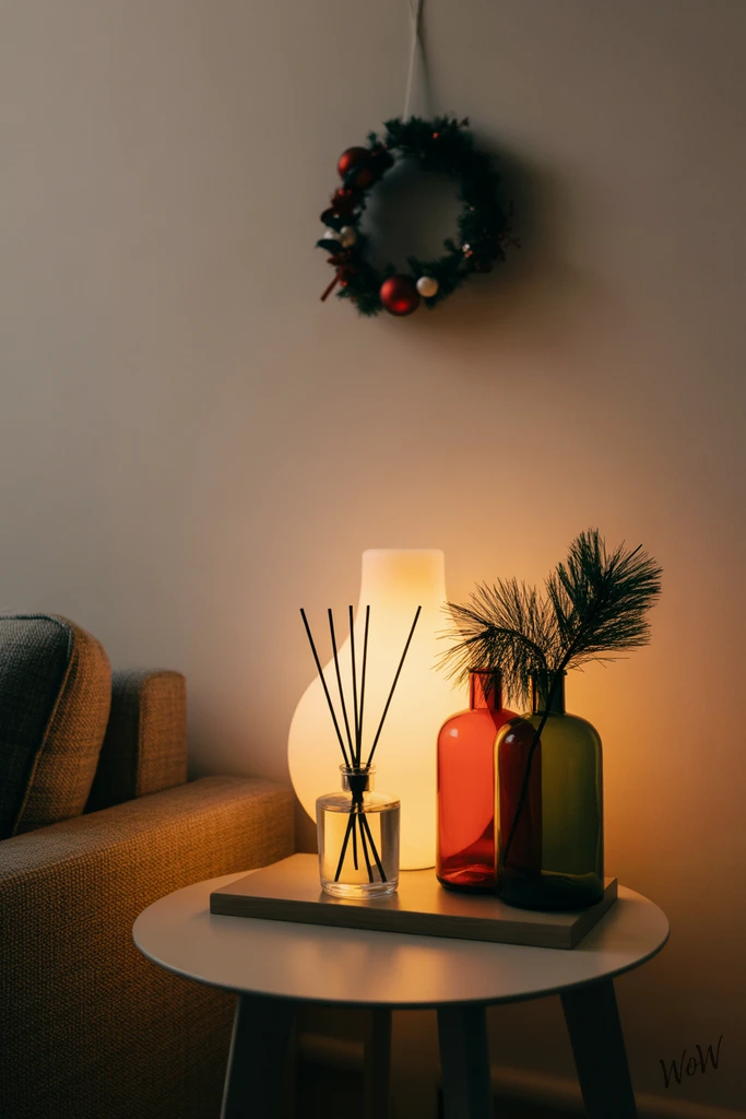 A holiday-scented reed diffuser cozy’s up a modern apartment corner; the trick is picking a festive blend like cinnamon and pine-nothing too overpowering, just enough to get you in a merry mood every time you walk by. Grab a decorative glass bottle in red or green (bonus points if it’s a fun shape), set it on a small side table, and arrange the reeds so the scent travels but doesn’t overwhelm the whole room.