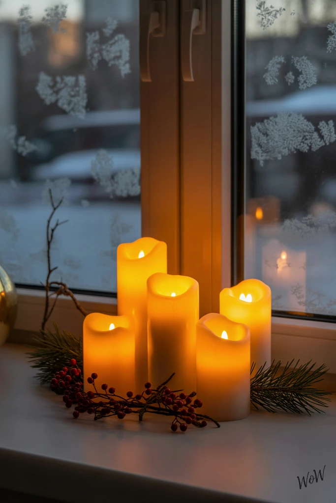 Warm LED candles are a game-changer for apartment Christmas decor-grab a few in different heights and cluster them on your windowsill for instant holiday magic. The amber glow bounces off frost-touched glass, making the whole space feel cozy, even if it’s cold outside.