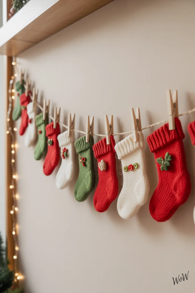 Mini knitted stockings in bold red, crisp white, and festive green look ridiculously cute lined up across a small mantel. String them up with sturdy twine or ribbon, clip each one with wooden clothespins, and let their unique details-like hand-stitched embroidery, mismatched buttons, or little bells-stand out.
