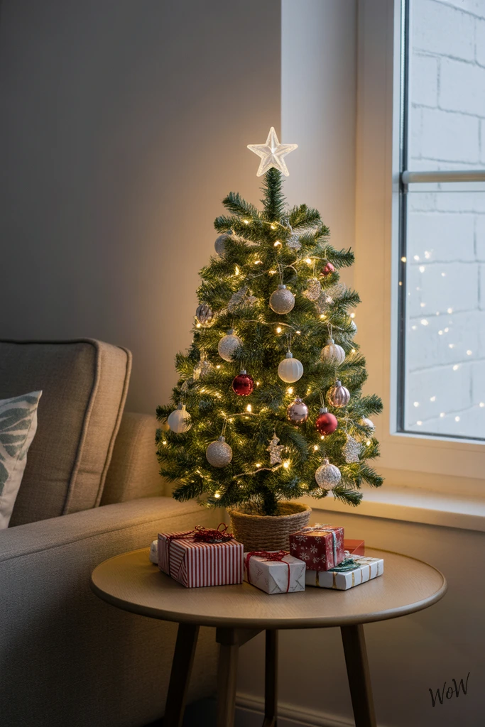 A miniature Christmas tree on your side table brings that festive spirit without eating up precious floor space. Look for a small, full-looking tree-about 1-2 feet tall-and set it in a cute pot or basket to anchor it visually.
