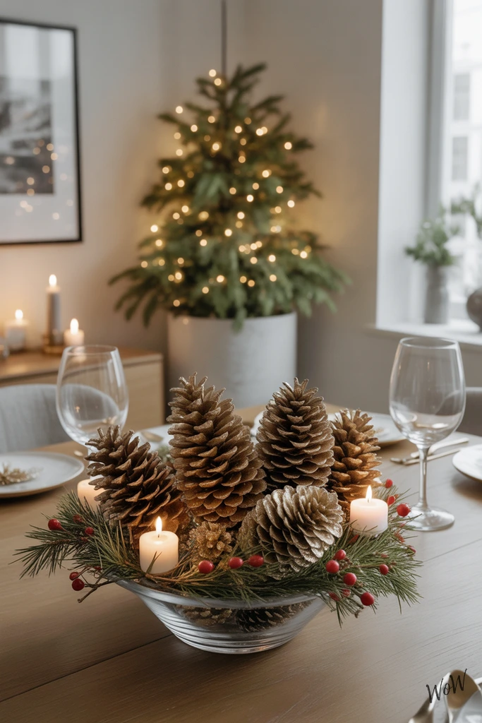 The combo gives off a cozy, understated holiday vibe that feels upscale but not fussy. Warm ambient lighting makes those gold flecks on the pinecones glimmer just enough; you can swap candles for battery tea lights if you’re in a rental or worried about open flames.