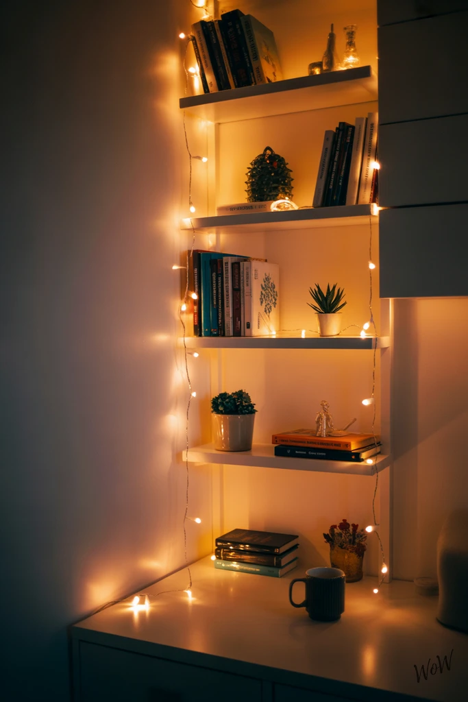 Choose battery-operated or USB lights for a clean look with no messy cords. Stick to minimalist arrangements: a couple of shelves, just a few plants, and a small stack of books is all you need.