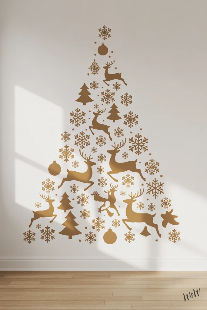 Whimsical Christmas wall decals are a renter’s dream-no nails, no mess, and when the season’s over, they peel off clean. Start with a blank wall, then arrange metallic gold and silver vinyl decals (snowflakes, reindeer, and ornaments work great) in the shape of a Christmas tree.