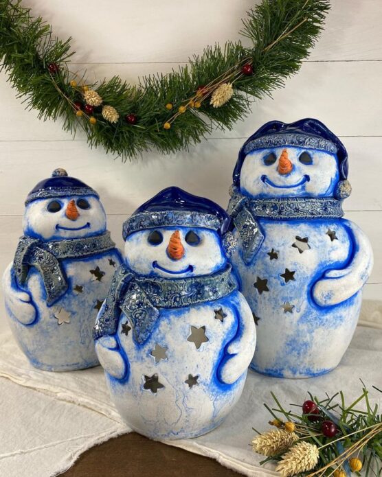 A row of blue snowman figurines instantly sets a playful, wintry vibe on your mantel; their glossy ceramic finish catches the twinkle of white fairy lights, making them pop against a neutral background. To nail this look, group snowmen of different heights (4-10 inches is perfect) for a collected, not-too-matchy lineup.