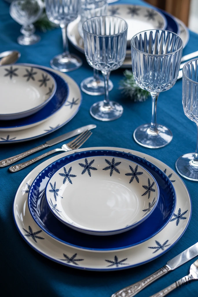Royal blue and white ceramic dishes instantly create a luxe, wintry vibe for your holiday table, their snowflake-patterned rims look festive but not over-the-top. Layer dinner and salad plates for depth, then add crisp white or soft blue napkins-bonus points if they’re tied with silver ribbon or a delicate napkin ring.