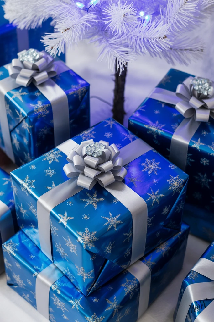 Deep sapphire blue wrapping paper instantly feels rich and elegant, especially when you pair it with shiny silver snowflake patterns that shimmer under the tree lights. For a truly luxe vibe, wrap each present as neatly as possible, then go big on the details-think generous silver ribbon bows that look almost too pretty to untie, and a sprinkle of tiny crystal gems for a frosty, glimmering touch.