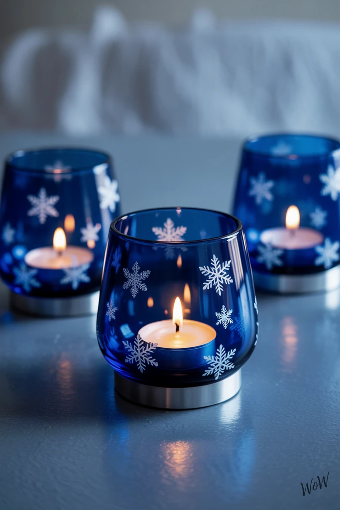 Look for holders with silver metallic bases for an extra touch of sparkle, this combo nails that frosty, festive look without feeling cheesy. Arrange them in clusters for more glow, or line them along a windowsill to let the blue shine outward.