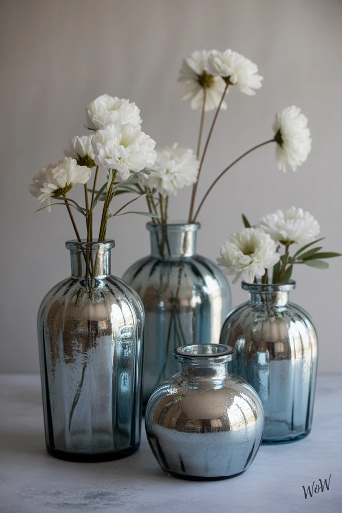 Blue mercury glass vases are pure winter magic-grab a few in different heights for the most visual impact, and go for ones with a frosted finish or a weathered silver patina to nail that vintage vibe. Cluster them together as a centerpiece, letting those sapphire tones catch the light and throw icy reflections across your table.