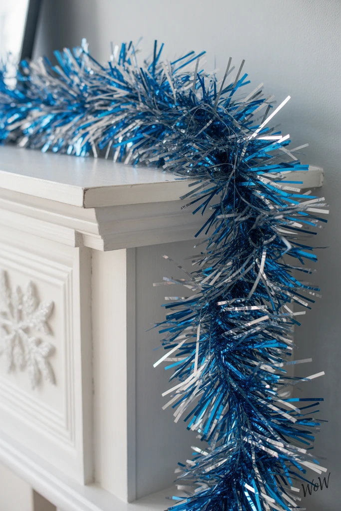 For a luxe winter wonderland vibe, layer different shades of blue: sapphire, ice, and pale azure tinsel together, letting the colors blend and play off each other. Secure the garland loosely so it cascades with a little bounce, and tuck in a few silver ornaments or fairy lights if you want even more dazzle.