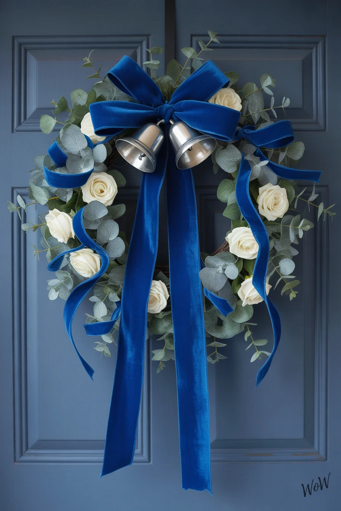 Rich blue velvet ribbons instantly bring a regal vibe to your holiday wreath, the deep color pops against frosty silver eucalyptus and crisp white roses. Start by choosing a wide, plush velvet ribbon-navy or royal blue works best for that luxe wintery effect.