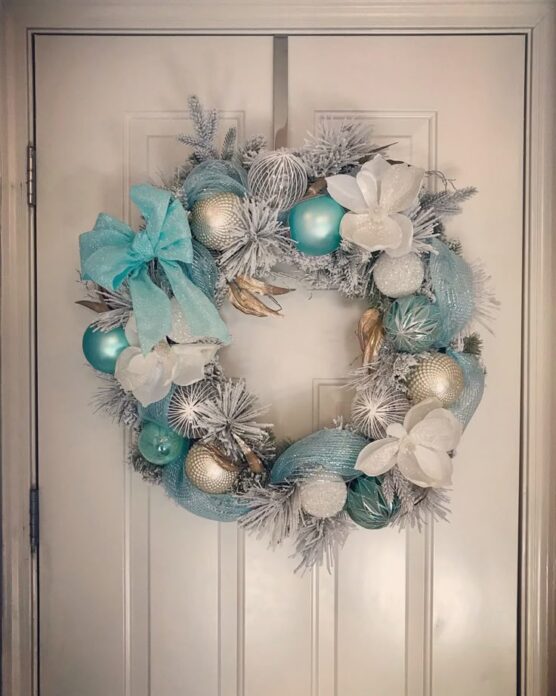Cool and dreamy, an icy blue wreath instantly brings winter’s magic to your front door or mantel. Start with a base of faux pine branches-look for ones frosted with silver tips, it’ll give you that snowy effect without the mess.