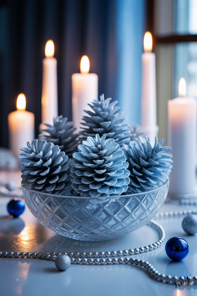 Frosted blue pinecones are a simple way to bring winter’s magic indoors-just grab a few real or faux pinecones and give them a coat of icy blue spray paint. After they dry, brush the tips lightly with white craft paint for a snow-kissed look, then while they’re still tacky, sprinkle on silver glitter so it sticks.