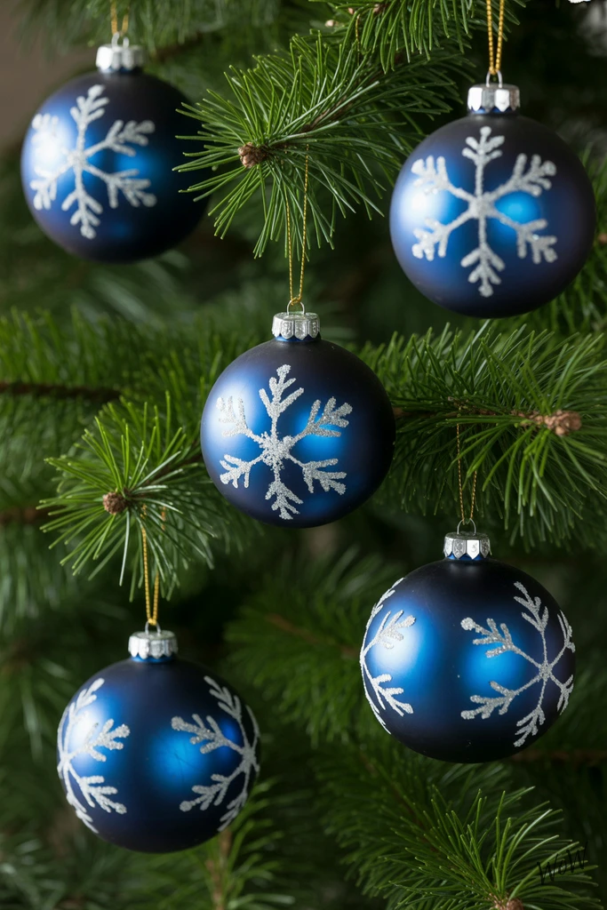 Navy blue glass ornaments with silver snowflake designs instantly add drama to your tree, their deep color pops against green pine needles, and the metallic accents catch the light beautifully. Mix frosted finishes with shiny, metallic luster for a layered, luxe effect-hang some close to the trunk for depth and others at the tips to highlight their sparkle.