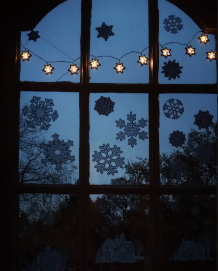 This is a mess-free way to decorate; no glue or tape needed and peeling them off after the holidays is painless. Blue snowflake’s are a subtle nod to winter, your guests will definitely notice the delicate icy patterns sparkling in the light.