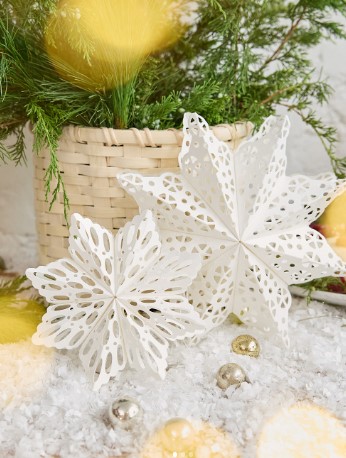 These ornaments reflect the simplicity and beauty of real snowflakes, making them a perfect fit for neutral or Scandinavian-inspired holiday styling. You can pair them with small ornaments, candles, or greenery for a cozy, layered display that feels festive without overwhelming the space.