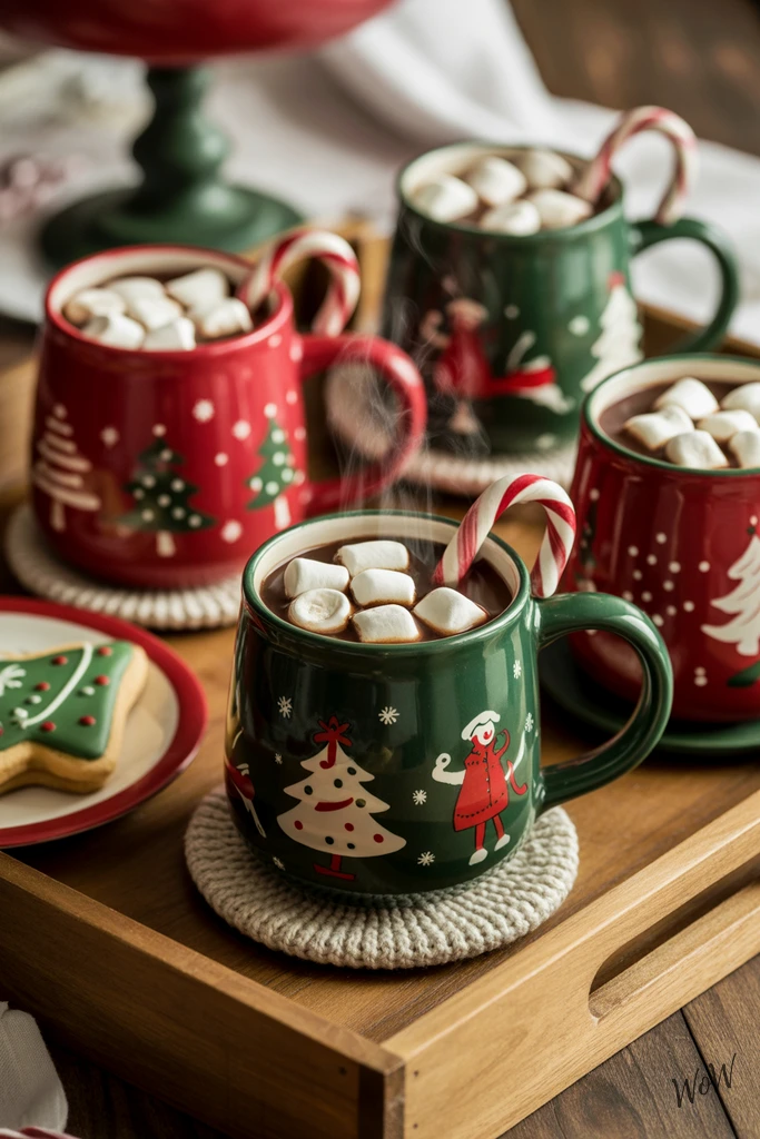 Gather a mix of vintage-inspired Christmas mugs-think rich reds and deep greens, with playful snowflakes or reindeer patterns-and arrange them on a rustic wooden tray. Stack each mug over a soft knit coaster to add texture (and protect your table), then fill them up with hot chocolate, the steam curling up through a cloud of mini marshmallows.