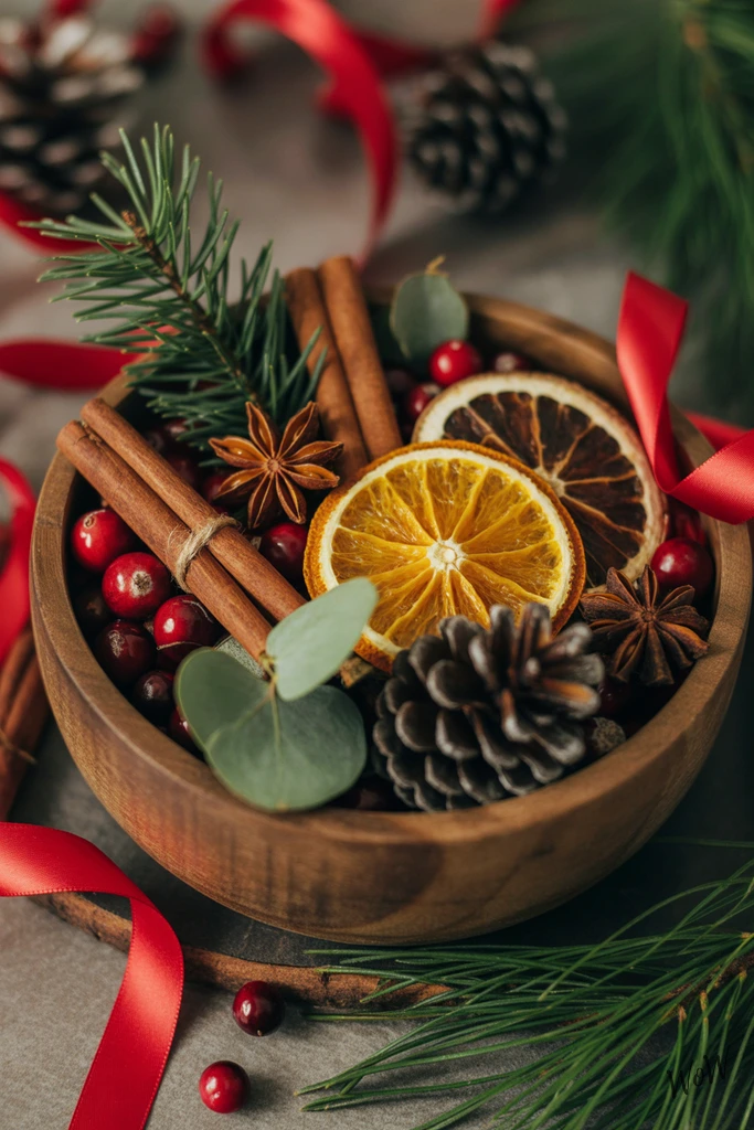 Fill a rustic wooden bowl with Christmas-scented potpourri to create a centerpiece that looks as good as it smells. Start with a base of dried orange slices, cinnamon sticks, and star anise-they bring warm, spicy notes and look gorgeous with their deep, earthy colors.