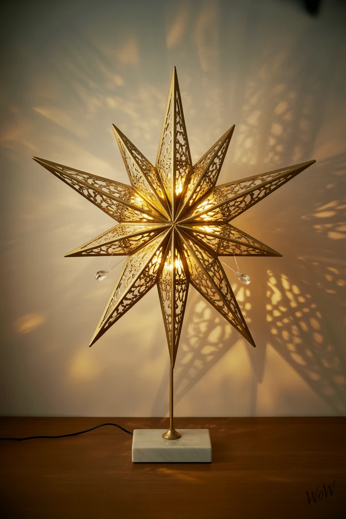 A modern Christmas star sculpture elevates your coffee table, adding a sculptural touch that feels both festive and chic. This striking piece, crafted from brushed gold metal, features intricate cutout patterns that let warm LED light shine through-casting mesmerizing shadows on your tabletop and surrounding décor.