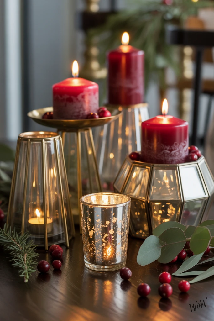 When those candles are lit, the metallic finish catches the flicker and bounces it around, making the whole setup shimmer against a dark wooden table-it’s practically magic. For a festive touch, scatter eucalyptus sprigs and cranberries around the bases; their greenery and berry red tones look lush and seasonal.