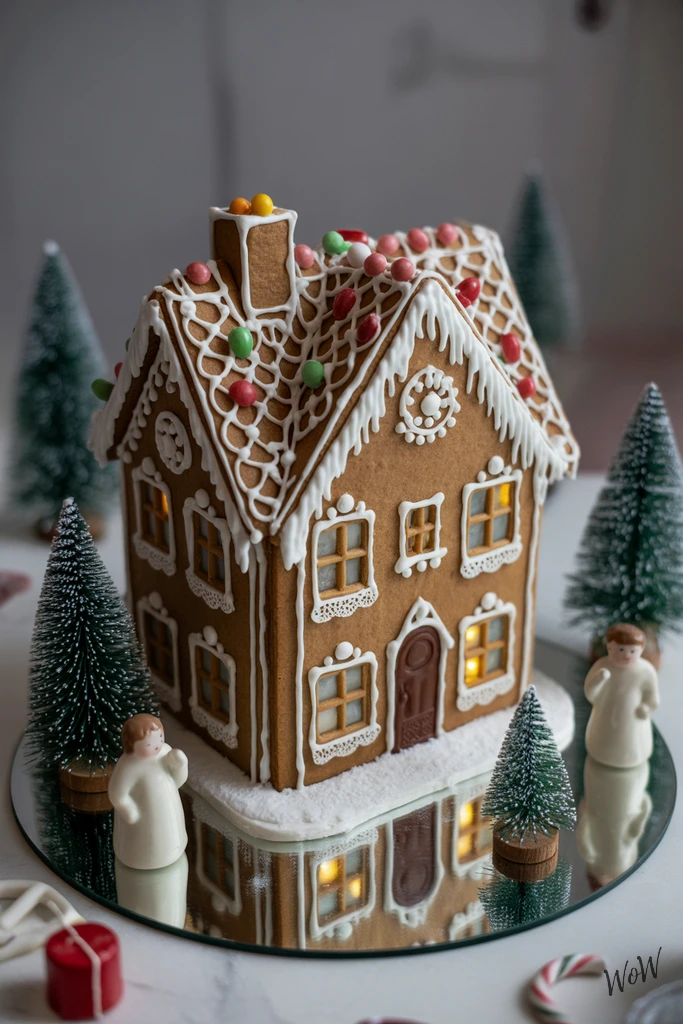 Set the house on a mirrored tray sprinkled with powdered sugar for a snowy effect, and then surround the scene with miniature bottle brush trees and ceramic figures. This centerpiece feels festive and nostalgic, and it’s the sort of thing that makes guests stop and smile.