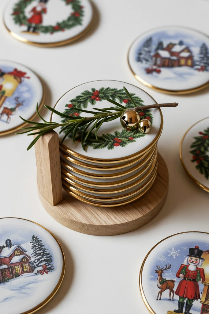 To make them look extra special, tie a sprig of fresh rosemary and a few tiny jingle bells around the holder with twine or ribbon. This touch adds a burst of greenery and a soft jingle whenever someone grabs a coaster.