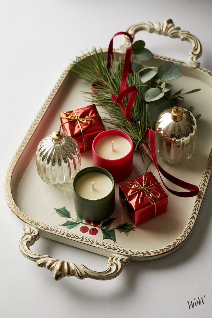 Arrange miniature wrapped presents, mercury glass ornaments, and red and green scented candles for a classic yet playful mix-textures and color’s pop against the tray’s details. Tuck a small bunch of fresh pine and eucalyptus into one corner, the scent will greet guests before they even sit down.