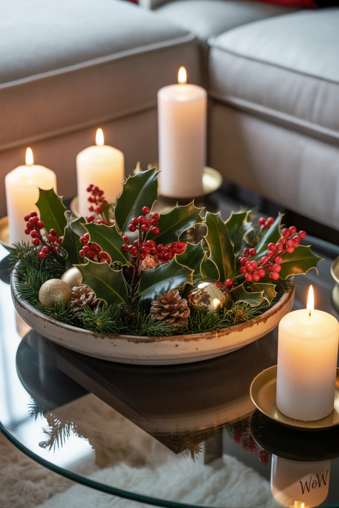 Picture a chic coffee table centerpiece: a low, wide ceramic bowl brims with fresh holly branches, their glossy green leaves and vibrant red berries popping against the neutral surface. Nestle a few pinecones and miniature ornaments among the greenery for texture and a playful holiday vibe, the ornaments can be classic red or shimmering gold depending on your room’s palette.