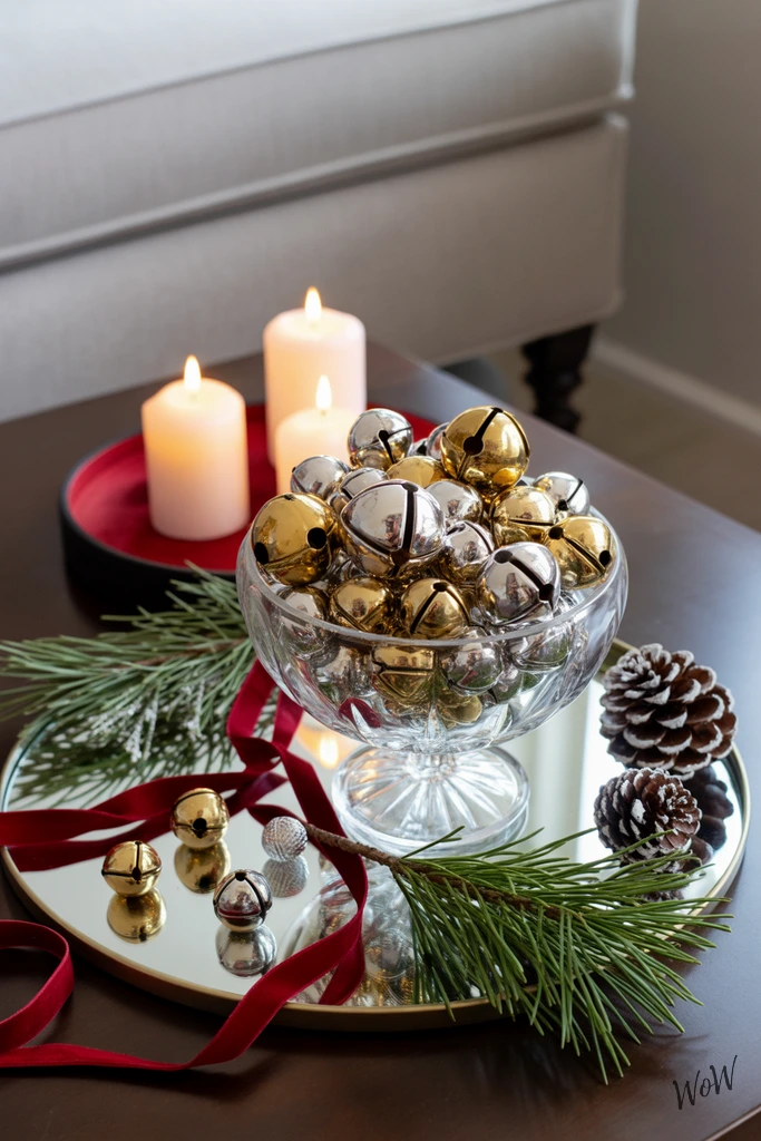 Let a handful of bells tumble artfully from the bowl onto the table, it looks casual but intentional. The whole setup feels inviting and festive, and it’s easy to put together-all you need are the bells, some greens, pinecones, and a pretty ribbon.