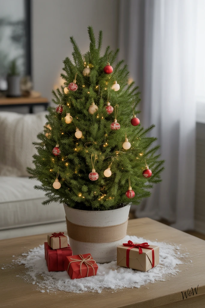 A mini Christmas tree makes your coffee table feel festive without taking up too much space. Choose a petite, lush evergreen (real or faux) and place it in a simple white ceramic pot-wrapping the base with a burlap ribbon adds a rustic, cozy touch.