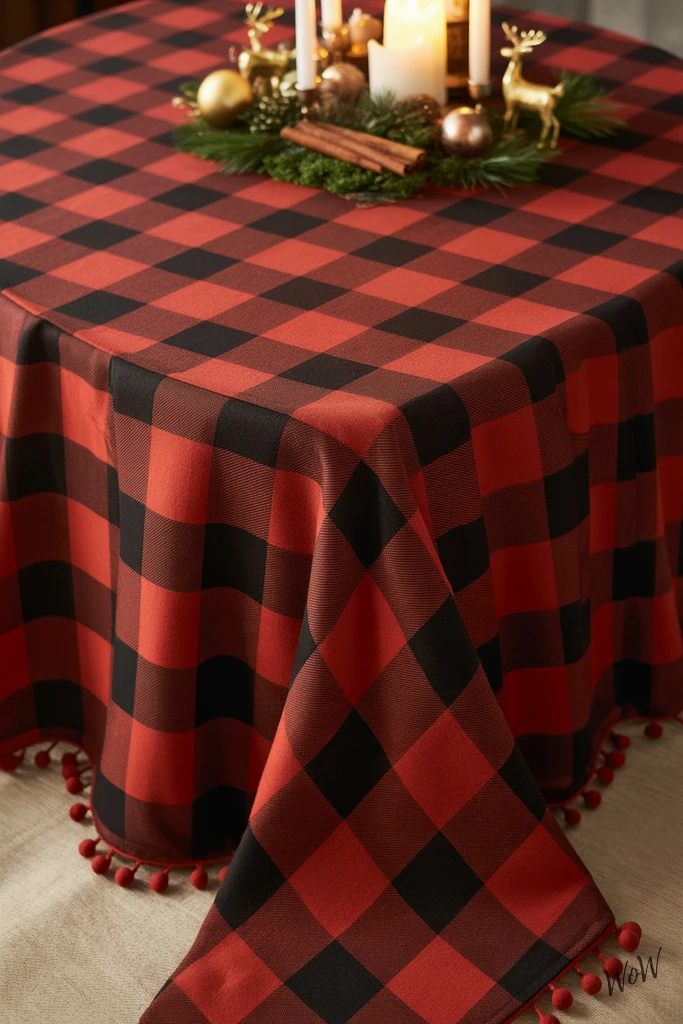A rich red and black buffalo plaid tablecloth sets a cozy, festive mood-it’s classic, bold, and feels like the holidays. Look for a version with a soft, textured fabric, draping it so the white pompom trim brushes just above the floor for a playful touch.