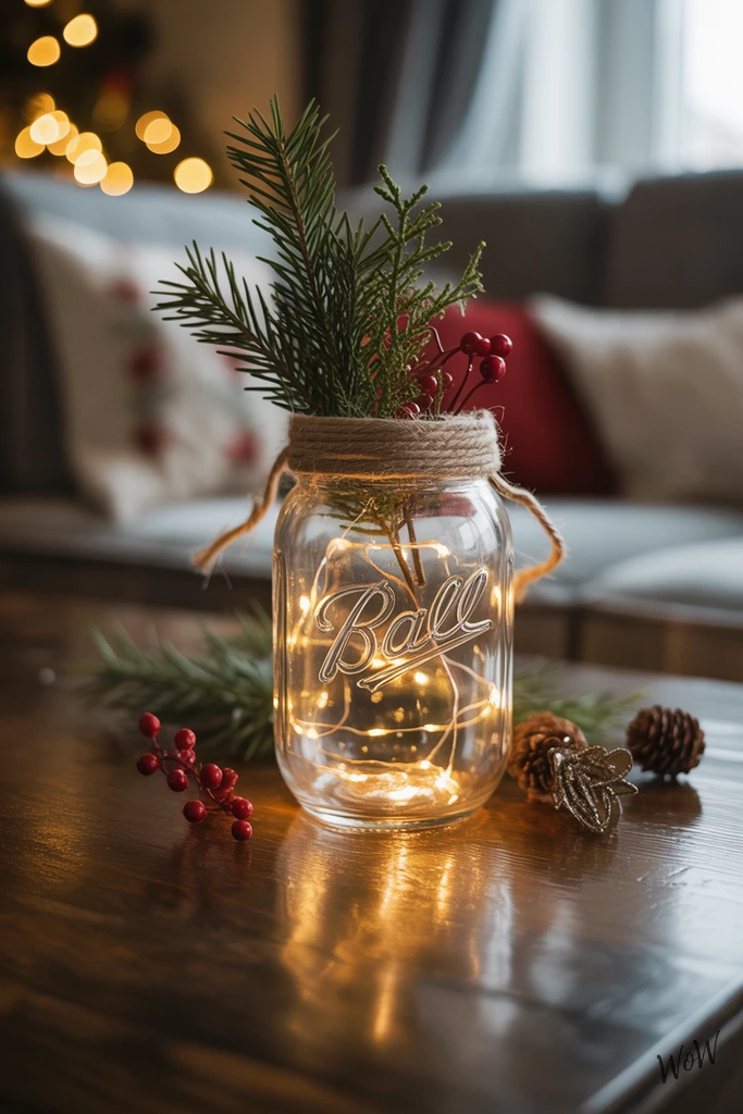 A mason jar packed with fairy string lights gives you instant Christmas magic, no electrical outlets needed. The clear jar lets the golden lights spill out in a warm, soft glow-think cozy cottage vibes on your coffee table.