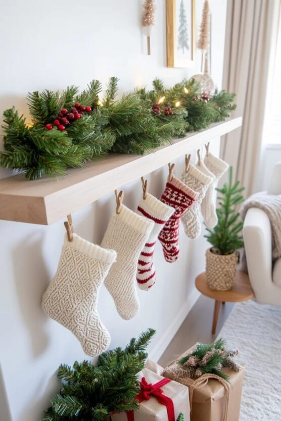 Hang them from sturdy hooks along a reclaimed wood mantel (the warm, weathered wood adds cozy character), making sure they’re spaced evenly. Don’t overstuff-just enough little gifts or treats to make each stocking look inviting and plump.
