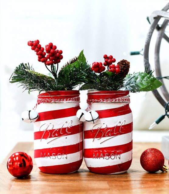 Candy cane jars are a fun and festive way to brighten up your living room during the holiday season. These painted mason jars, decorated with cheerful red and white candy cane stripes, instantly add a playful pop of Christmas color to any space.