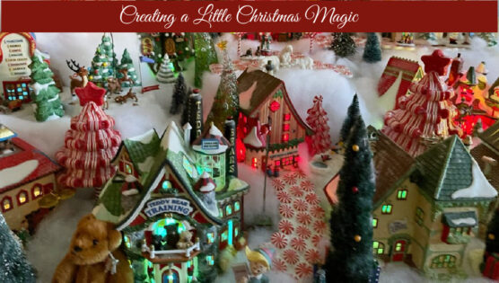 Look for wintery scenes: miniature cottages, skating ponds, even Santa’s busy workshop. Arrange these on a mirrored tray, which bounces light and makes the collection look fuller.