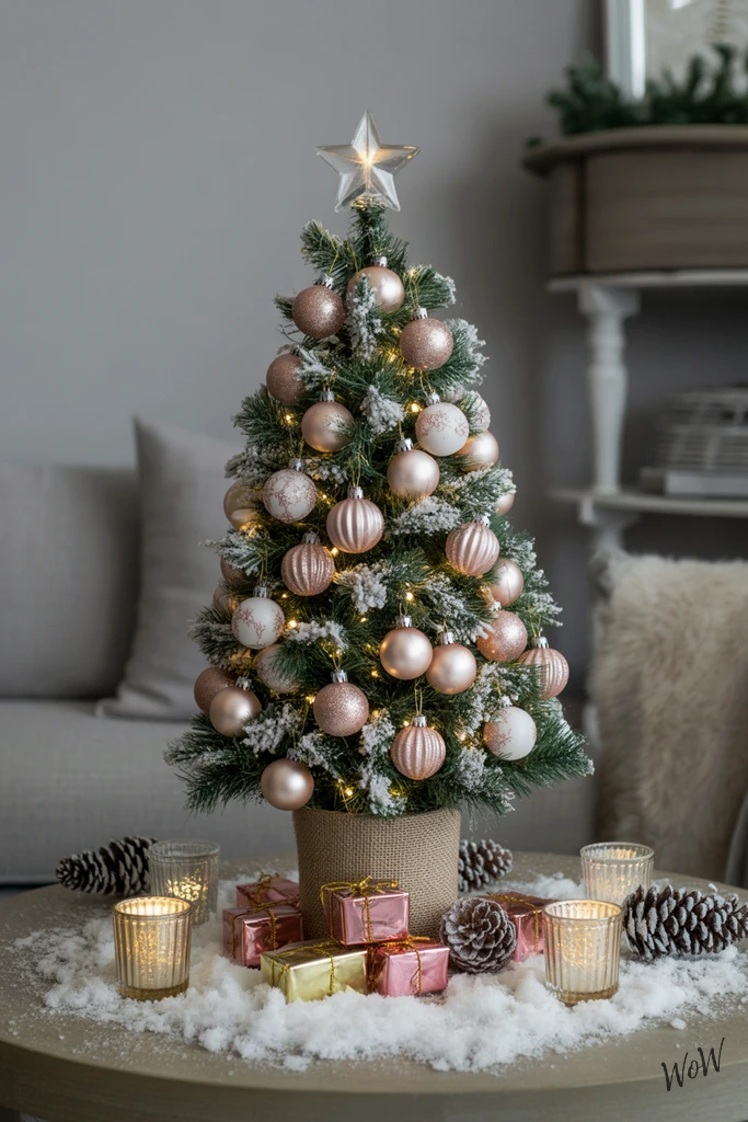 Hang tiny ornaments that match your chosen palette, then top it off with a sparkly star, it’ll catch the light and draw everyone’s eye. Nestle the tree in a burlap-wrapped base for rustic charm; tuck a few mini, gift-wrapped boxes underneath for a playful touch.