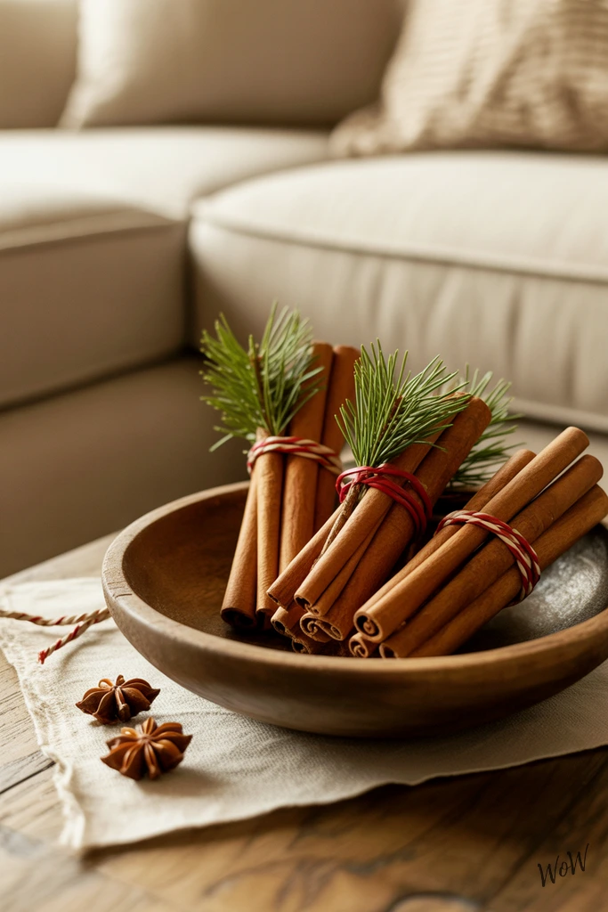 Tuck in a small pine sprig under the twine for that pop of green, it’s a quick way to add some holiday freshness. Arrange these bundles in an old wooden bowl, letting them nestle together naturally; the rough wood contrasts beautifully with the cinnamon’s smoothness and the pine’s needles.