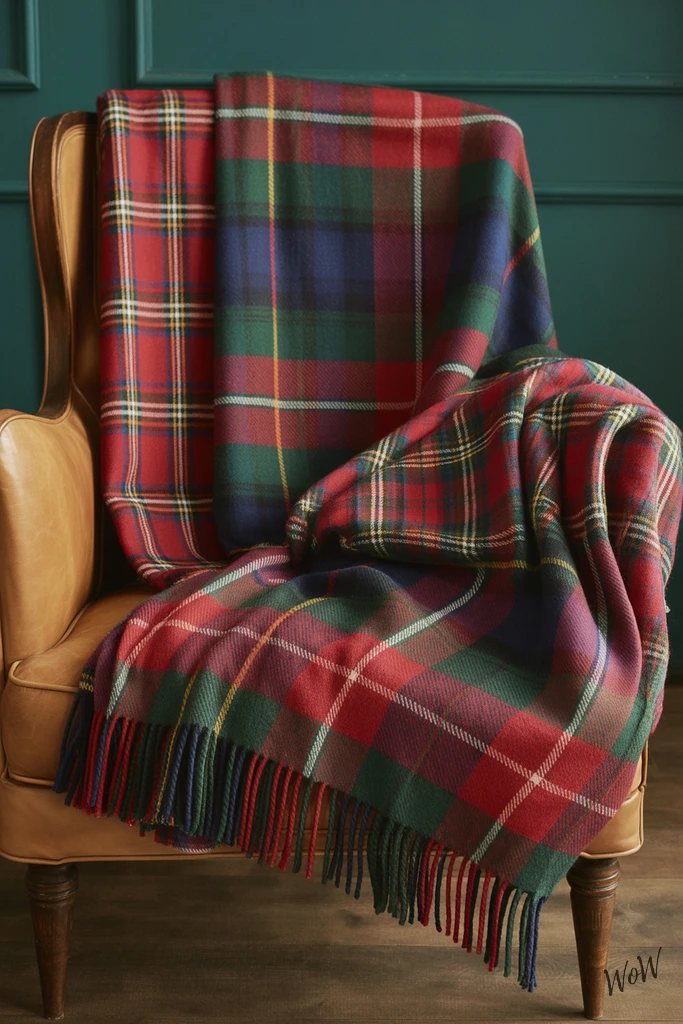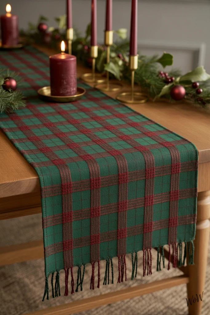 A deep emerald green and burgundy plaid table runner brings holiday luxury to your coffee table, the rich colors pop against natural wood or even a neutral surface. To get this look, find a quality runner with bold tartan patterns and tasseled edges-let them drape over the sides for extra drama and softness.