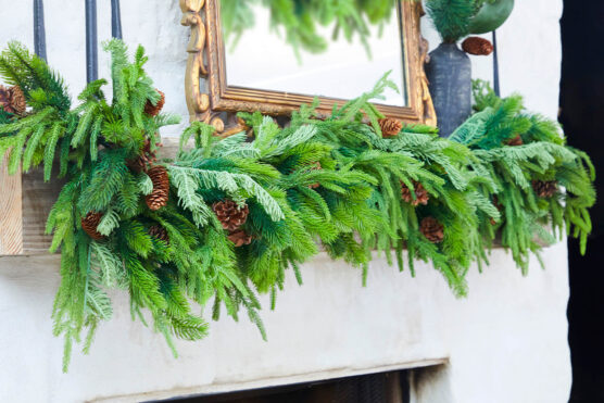 Tuck in burgundy velvet ribbon in loose loops, it adds a touch of luxury, while scattered pinecones dusted with just a hint of gold glitter catch the light and give a magical feel. For extra sparkle, nestle small copper and champagne ornaments into the garland; their shine pops against the greenery.