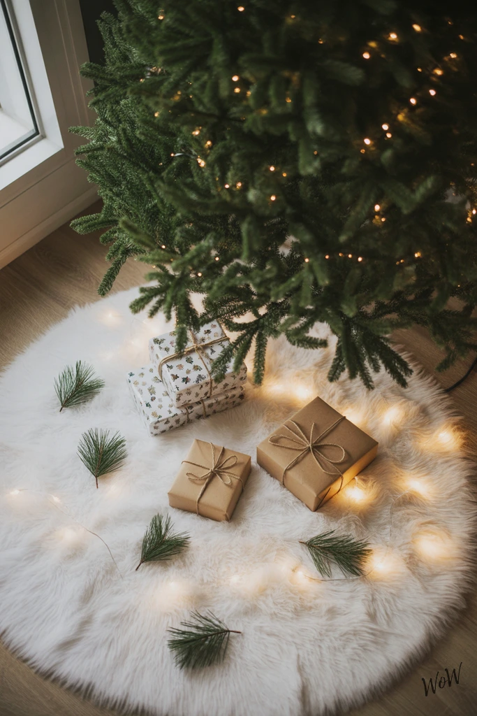Lay a plush white faux fur rug under your Christmas tree to mimic a snowy landscape-it’s the easiest way to create that magical, winter wonderland vibe without any mess. The soft, fluffy texture looks gorgeous with twinkling tree lights reflecting off each fiber, giving your living room a warm, inviting glow.