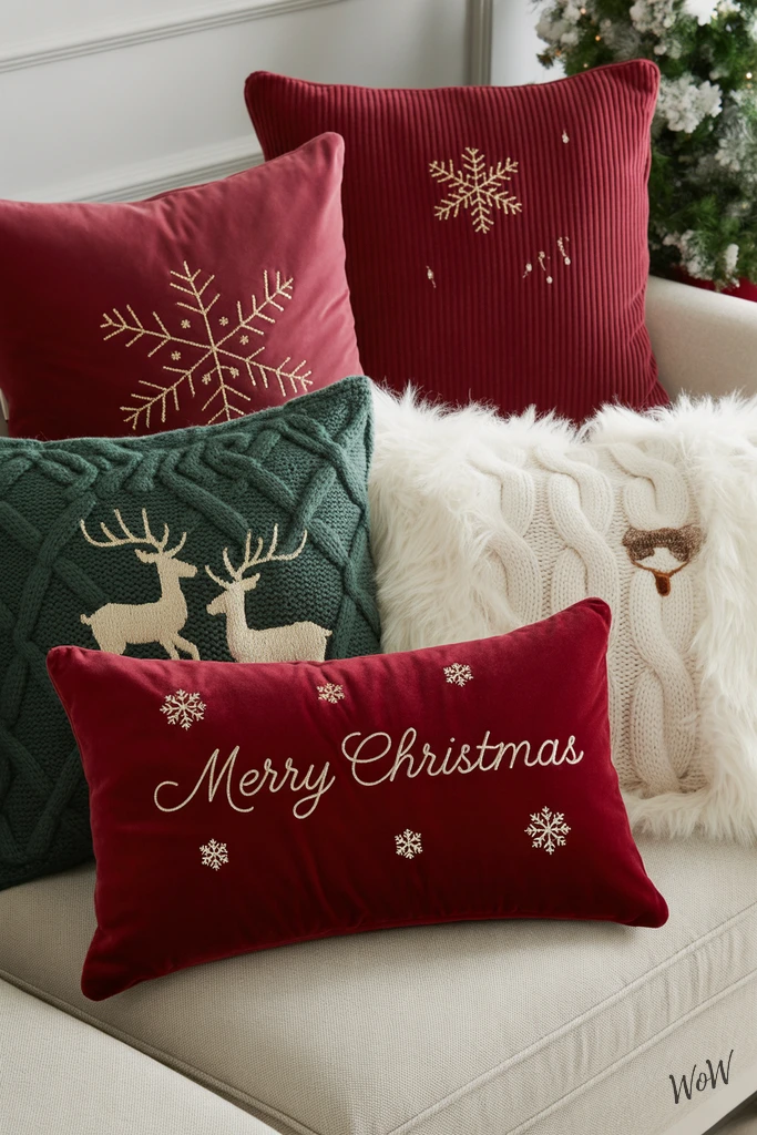 Swap out your usual pillows for a mix of plush velvet and chunky-knit throw pillows in festive shades-think deep crimson, forest green, and snowy white. Layer them on a neutral sofa for instant holiday coziness, don’t worry about matching everything perfectly; the variety makes it feel collected and inviting.