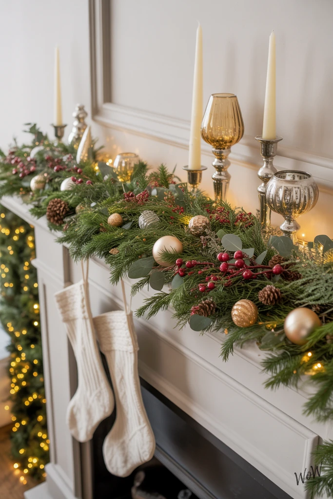 Thread warm fairy lights along the garland, making sure they’re woven throughout so every detail glows when the room’s lights are low. Hang stockings underneath, letting them dangle just below the garland, and for an extra touch, place vintage mercury glass candle holders with ivory tapers right on the mantel; their flicker will make the whole setup feel magical.