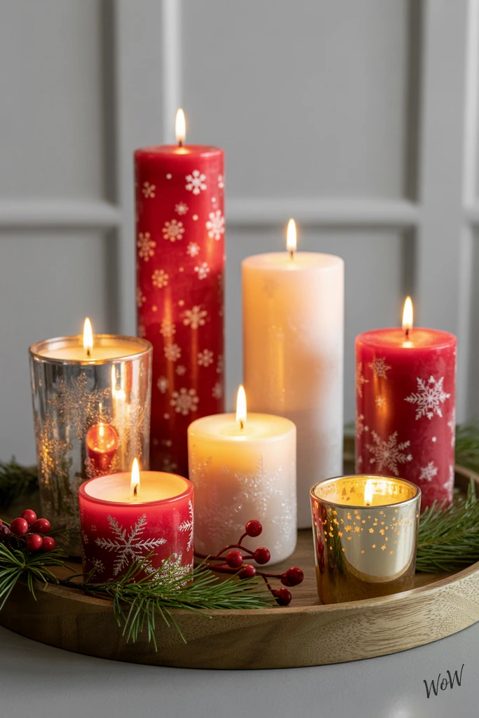 Look for candles that have embossed snowflakes or stars on their surface; they catch the light in cool ways and feel extra special. Add in a few mercury glass and ceramic holders in rich reds and golds, which bounce the candlelight around your living room, making everything feel cozy.