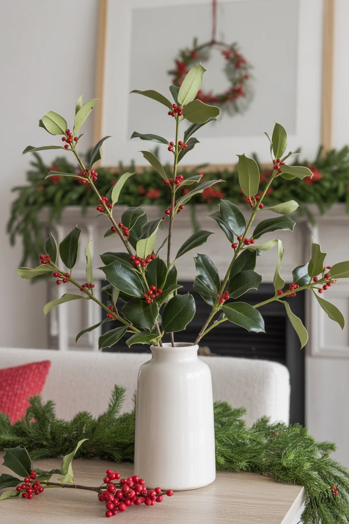 Fresh holly branches bring that instant holiday magic-shiny, deep green leaves paired with bright red berries are the ultimate Christmas pop. Start by filling a simple white ceramic vase with a bunch of holly sprigs, let the foliage spill over the rim for a lush, organic feel.